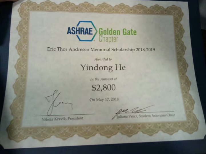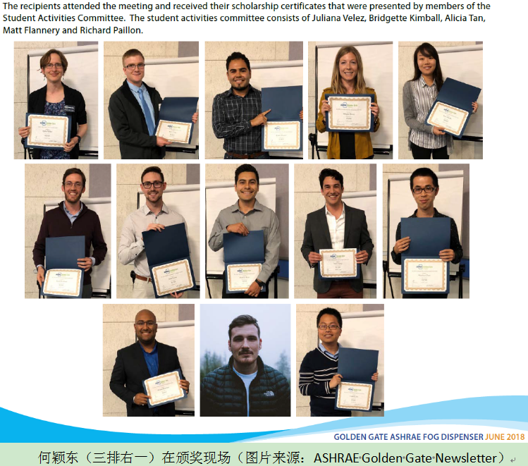 2018517日,美国采暖、制冷与空调工程师学会(American Society of Heating Refrigerating and Air-Conditioning Engineer)金门大桥奖(ASHRAE-Golden Gate Scholarship)颁奖仪式在美国旧金山举办。土木学院2014级直博生何颖东凭借以“Usage, Models and Effects of Personal Comfort Systems in Buildings”为主题的研究获得美国采暖、制冷与空调工程师学会金门大桥奖,同时也是所有获奖人员中仅有的两位中国学生之一。