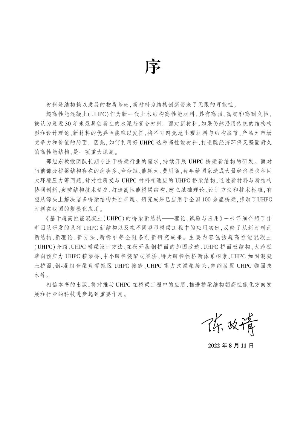 邵旭东教授等撰写的《基于超高性能混凝土(UHPC)的桥梁新结构——理论、试验与应用》一书由人民交通出版社出版,中国工程院院士陈政清为该书作序。