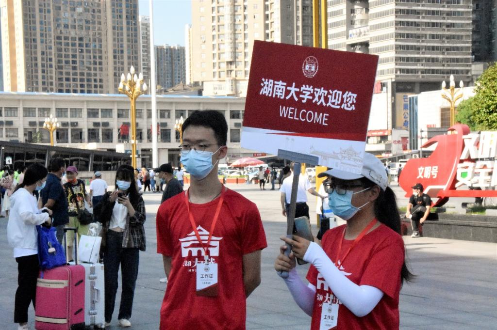 欢迎您”牌子的志愿者们,他们热情地向新同学打招呼,解答他们的疑问并引导他们前往宿舍报道;在火车站、高铁站迎新站点,一看到同学或者家长往站点走来,志愿者就马上热情地迎上去。