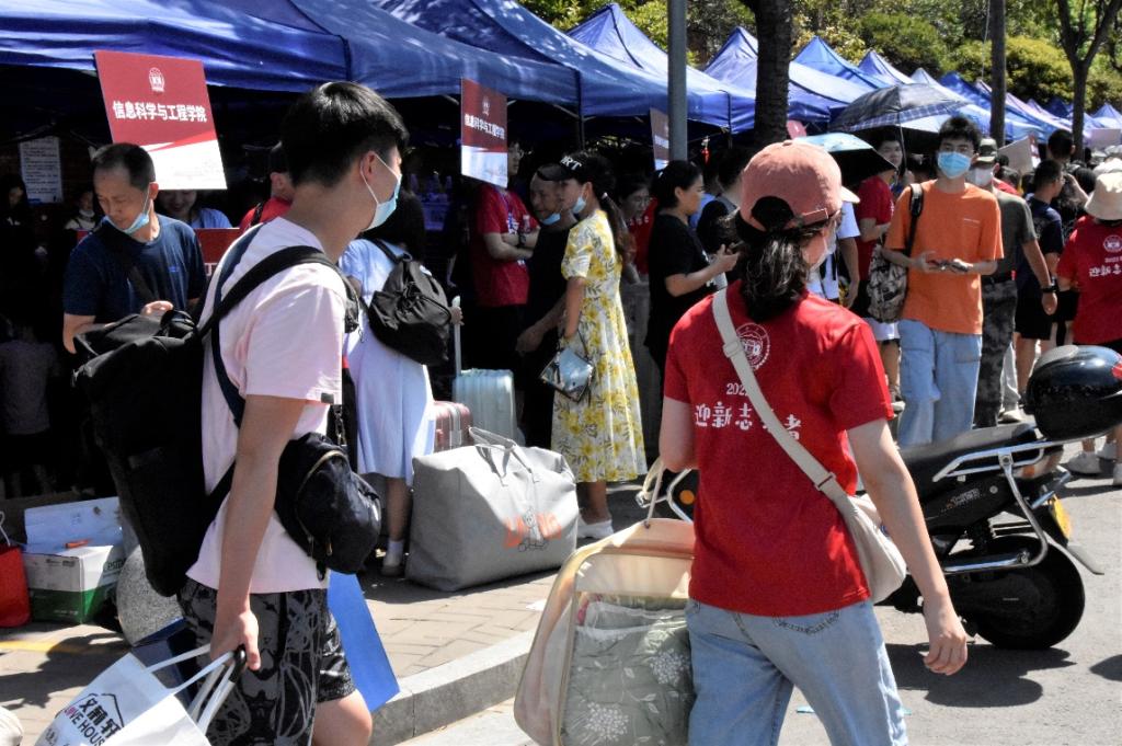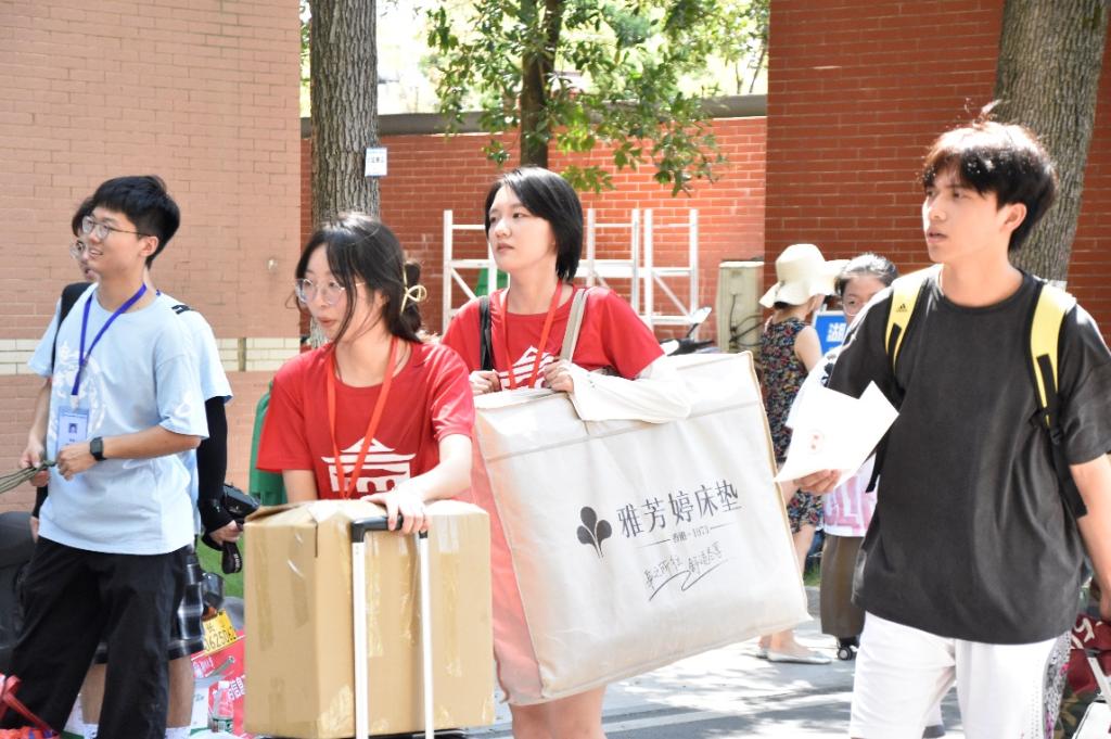 天马、德智宿舍园区,新生在志愿者以及学院新生助理的帮助下进入宿舍园区完成后续报道流程。