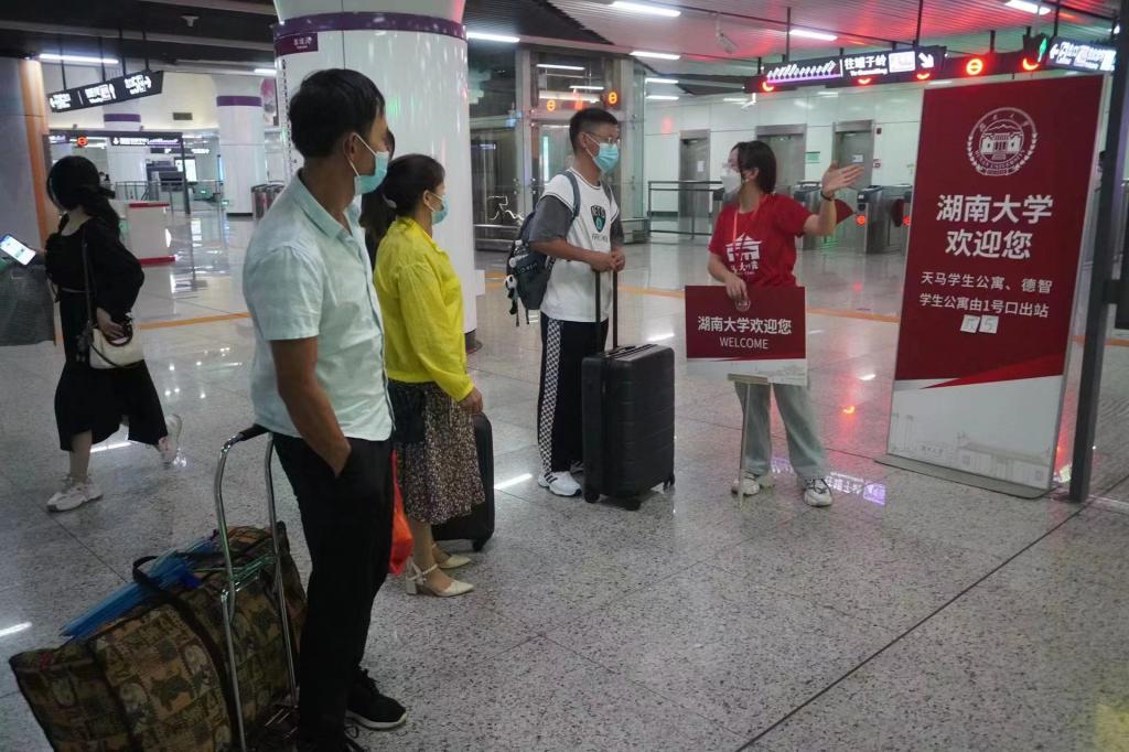 在地铁出站口同样也有一群红衣青年迎新志愿者接待刚下地铁的新生和家长,并指引他们到达宿舍区。