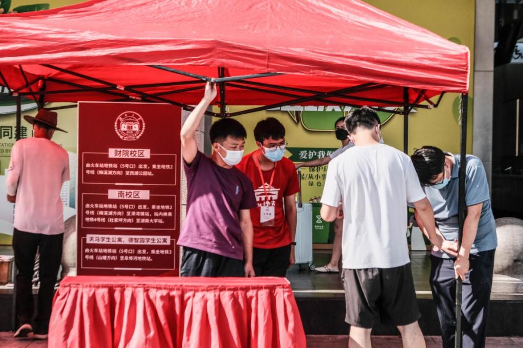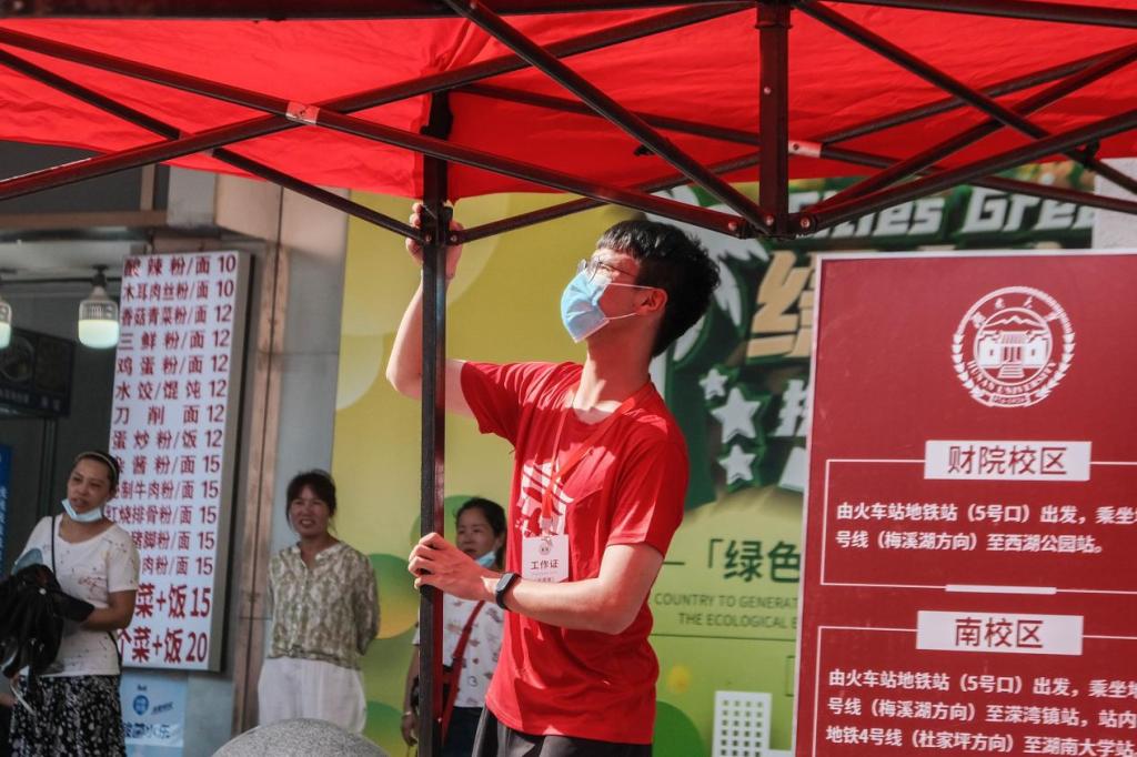 在炎日下一个个红色的帐篷立了起来,为迎新志愿者和即将到来的新生和家长带来一片清凉,迎新准备工作井然有序,落地接站迎新志愿者蓄势待发,期待着新生的到来。