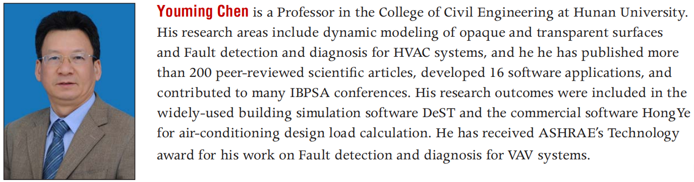 陈友明教授长期从事建筑节能、建筑性能模拟与控制研究,主持包括国家自然科学基金重点项目、国家重点研发计划课题、国际合作等科研项目30余项,发表学术论文200余篇,出版专著4部(合著),其中第一作者专著3部,获得发明专利5项,软件著作权17项。陈友明教授在建筑围护结构非线性动态建模领域中的研究成果已集成应用于建筑能耗模拟软件和空调负荷计算软件中,在空调系统在线故障检测诊断领域中的研究成果获得了ASHRAE技术奖。