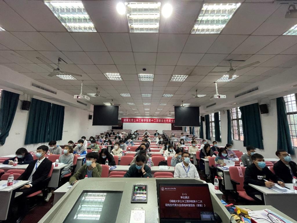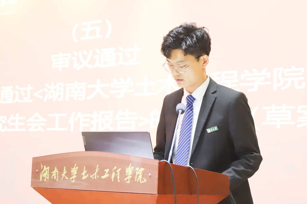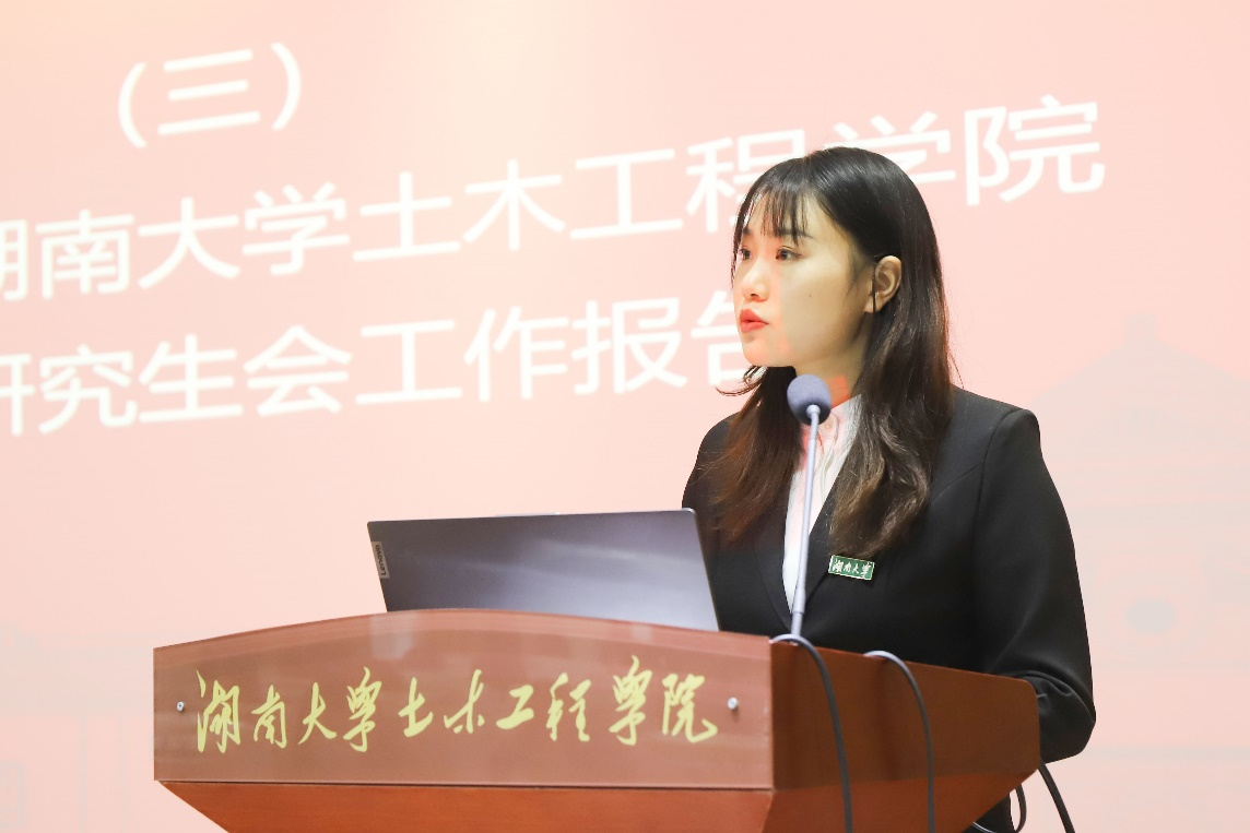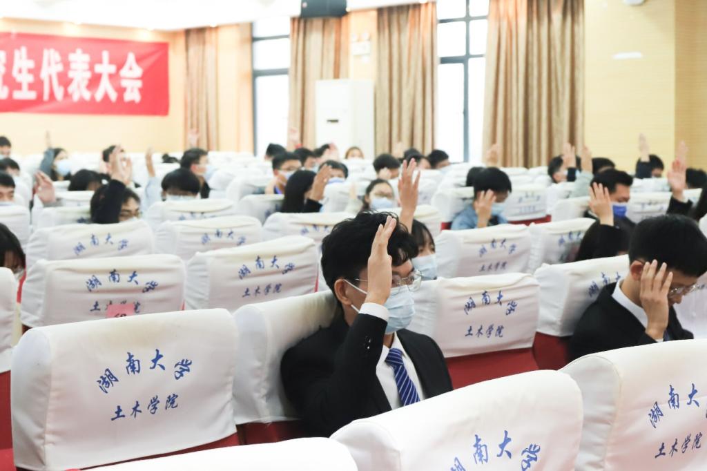 党委书记彭嘉芬、党委副书记秦鹏、学工办主任田文婷及学院辅导员出席会议。来自全院的123名研究生代表参加本次大会,听取会议并选举产生新一届土木院研究生会主席团。
