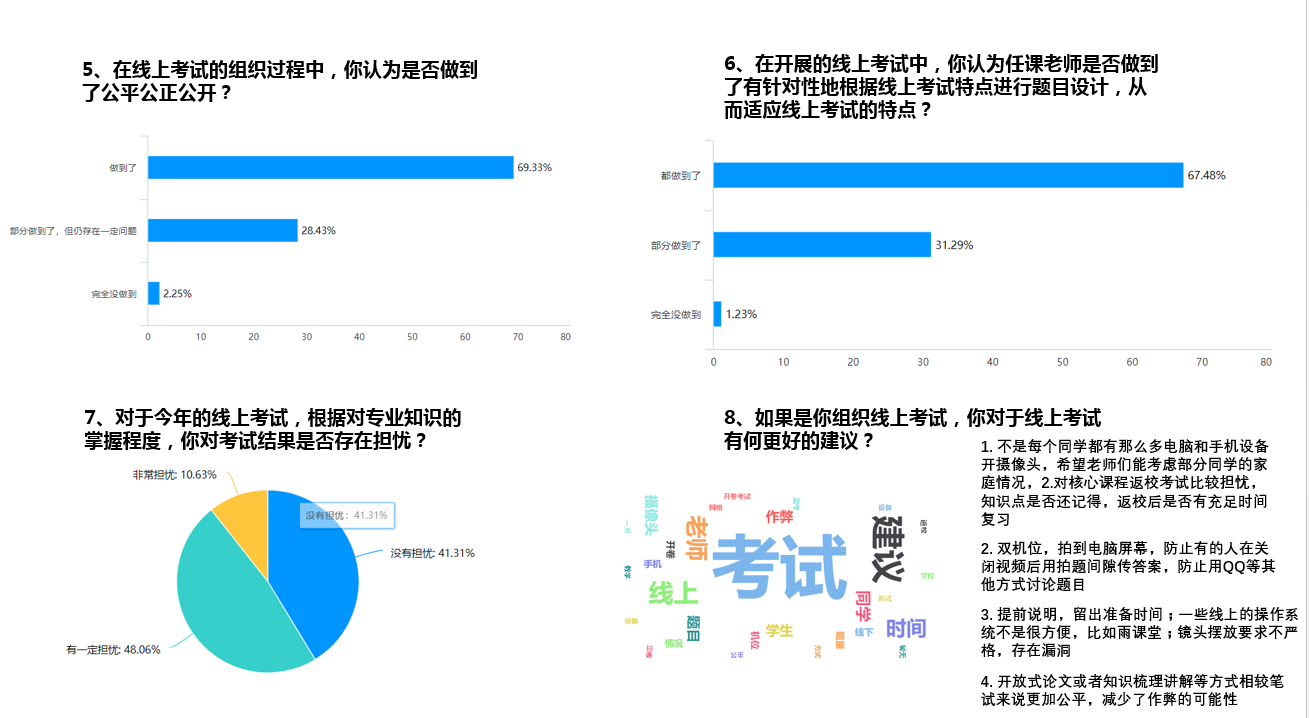 所有参与线上考试考生,问卷涉及到489人参与率达98.9 %。以“学生中心,成果导向,持续改进”的认证要求,对学生的观点和情绪有针对性地进行了解,并为未来可能出现的复杂局面做好了持续改进的准备。从调查结果来看,学生表示普遍理解和支持线上考试,对考试前各方面的组织工作表示认可,对考前老师的工作表示满意,并对今后类似工作开展提出了合理化建议。