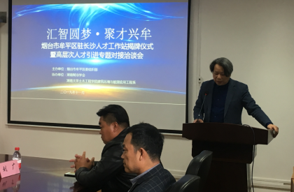 2019年11月12日下午,湖南省制冷学会与烟台牟平区组织部“牟平区驻长沙人才工作站揭牌仪式暨高层次人才与科研服务专题对接洽谈会”在学院B211报告厅举行,牟平区委组织部相关领导、烟台市部分企业代表和土木学院部分教师出席了本次会议。本次会议由建筑环境与能源应用工程系党支部书记龚光彩教授主持。