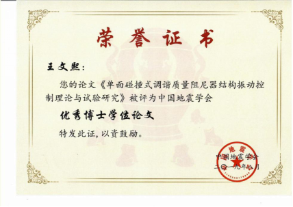 王文熙博士学位论文《单面碰撞式调谐质量阻尼器结构振动控制理论与试验研究》获中国地震学会首届优秀博士学位论文。中国地震学会优秀博士评审工作在中国地震学会领导下,由中国地震学会优秀博士学位论文评审委员会负责组织实施,本次共遴选出5篇优秀博士论文。2019年8月16日,在中国地震学会成立四十周年学术大会上进行了颁奖仪式。本届大会共邀请8位中国科学院和中国工程院院士进行大会报告,共有约500名来自国内外的相关研究人员参加。会议共分为26个专题报告,主要涉及地震灾害风险管理对策、强震动观测技术与应用、近远海重大工程与海洋沿途防护、遥感技术与地震学应用等多个前沿和热点方向。
