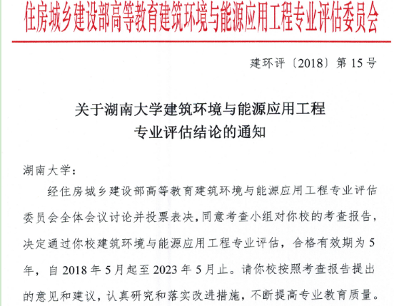 2018年6月8日,住房和城乡建设部高等教育建筑环境与能源应用工程专业评估委员会印发了《关于湖南大学建筑环境与能源应用工程专业评估结论的通知》(建环评(2018)第15号),通过了亚洲偷拍