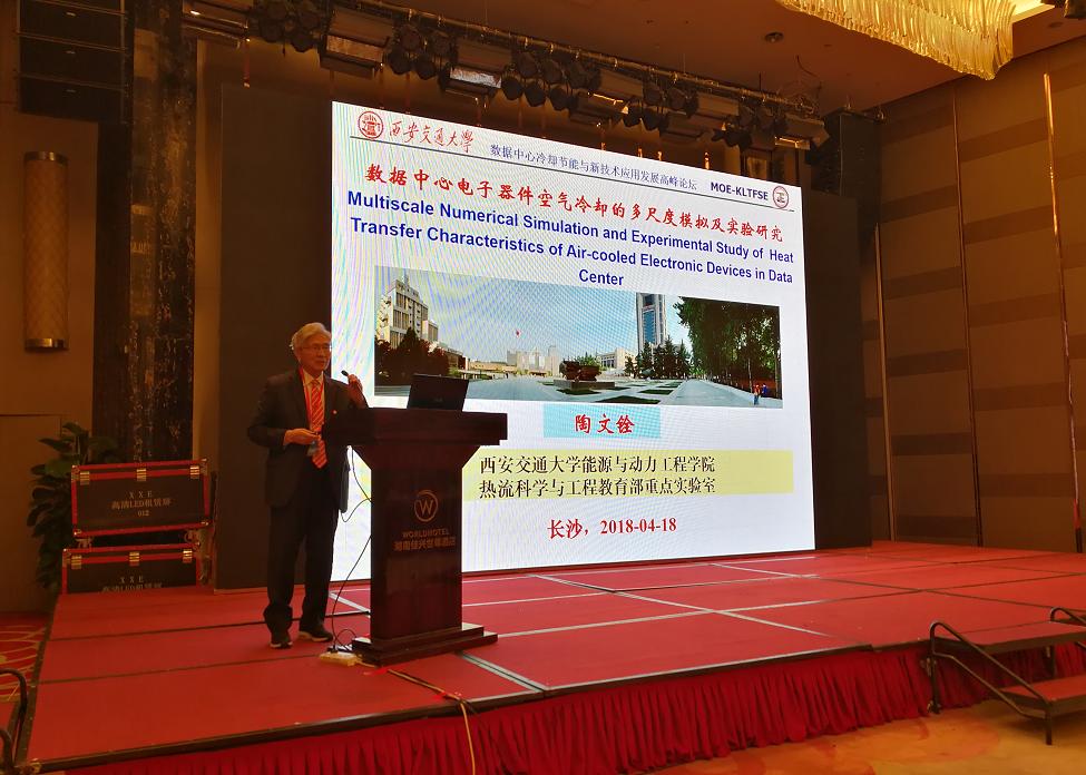 张泉教授、中讯邮电咨询设计研究院李红霞高工主持。陶文铨院士做了“数据中心电子器件空气冷却特性的多尺度数值模拟”的主题报告,随后中国电信湖南分公司副总经理万鹏,海尔中央空调数据中心行业销售总监朱旭红,京东云公司事业部高级总监张敬,湖南元亨科技股份有限公司董事长陈力,广东省邮电规划设计院有限公司副总工吴冬青以及大连理工大学教授刘明生依次发表了主题报告。