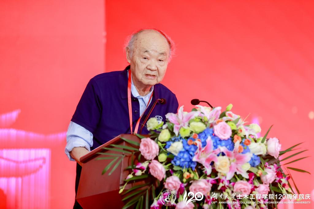 1958级校友代表、中国工程院院士周福霖发言。他表示,60年前在湖大土木的学习经历影响了自己的一生,不仅仅是学习到了专业知识,更重要的是确定了人生目标,培养了做学问的精神,并立下了一生要为国家做贡献的理想。也希望大家能根据国家的需要和自身的条件坚定理想,锲而不舍,持之以恒,在自己的专业上做到极致。他衷心祝愿湖大土木以120年院庆为新起点,把学院建成后劲十足,能够连续不断产生顶尖人才、高水平教学成果和科研成果的摇篮。