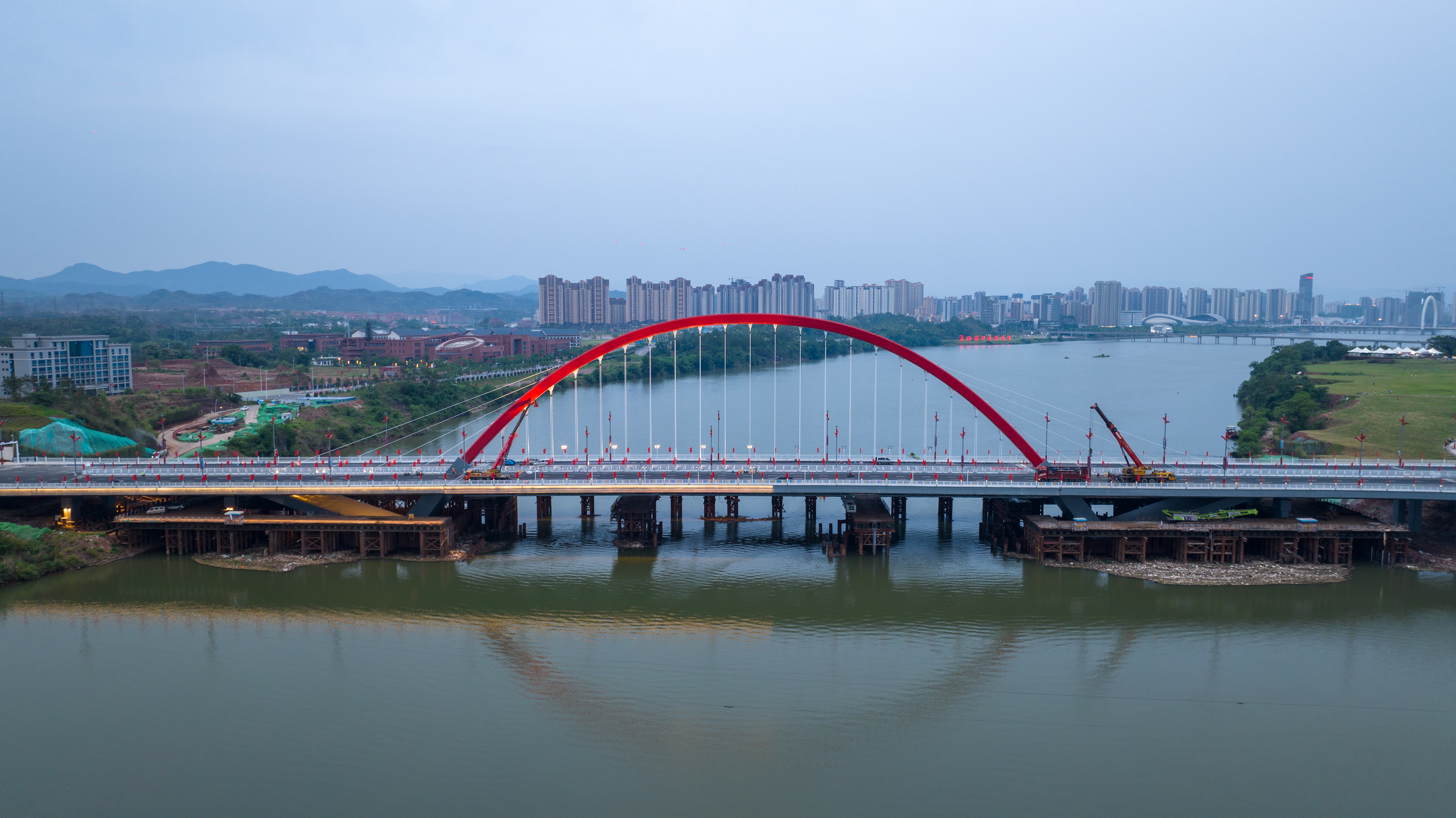 与中建五局联合共同研发,在“长征渡口第一桥”原址新建的于都胜利大桥正式通车。于都胜利大桥位于长征国家文化公园(于都段)展示区总长515.9米,标准桥宽40米,双向六车道布置,最大单跨168米,是于都县首座特大桥,也是贡江上的新地标,项目通车后将进一步优化城市交通网络体系,便利群众出行,推动于都县经济尤其是红色旅游产业高质量发展,对助力革命老区振兴具有重要意义。