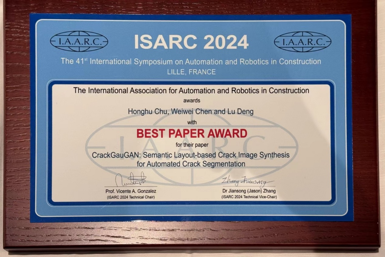 6月3日-5日,第41届国际建筑自动化和机器人国际研讨会(ISARC,International Symposium on Automation and Robotics in Construction)在法国里尔召开,学院邓露教授团队受邀做大会主旨报告。本次大会共评选12篇优秀论文,邓露教授团队2篇论文被评选为优秀论文,其中一篇获得大会唯一“最佳论文奖”。