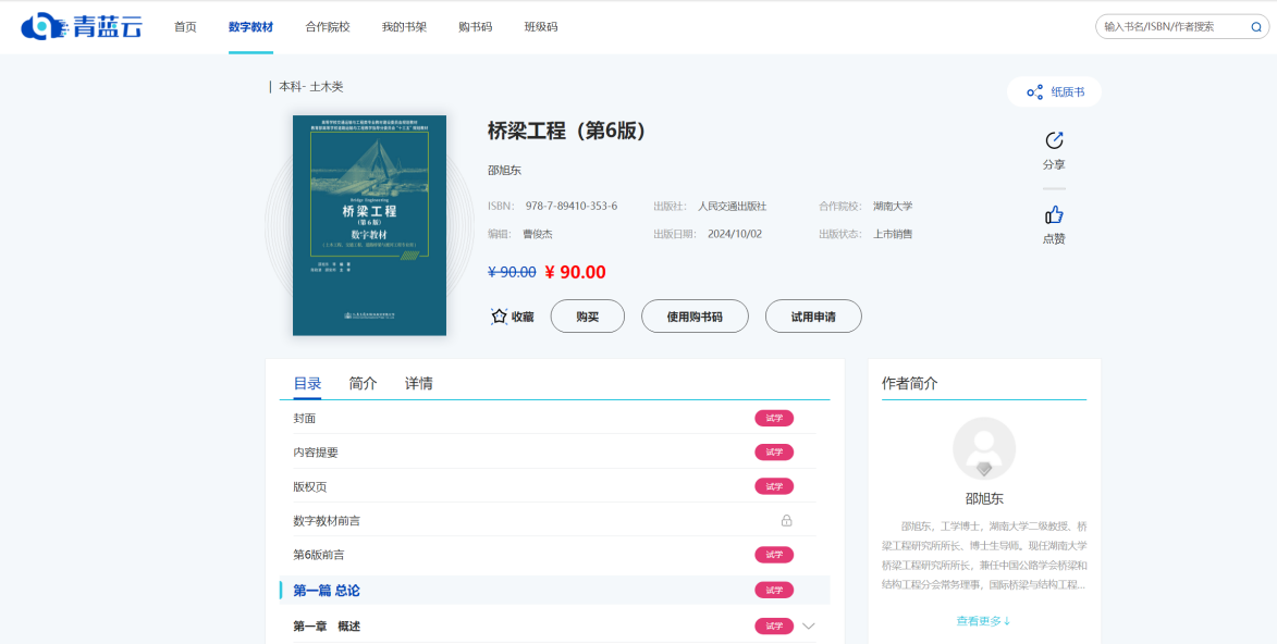 邵旭东教授等主编的《桥梁工程(第6版)》数字教材在“青蓝云”数字教材平台正式发布。教材由人民交通出版社出版,上海同豪土木工程咨询有限公司参与制作。