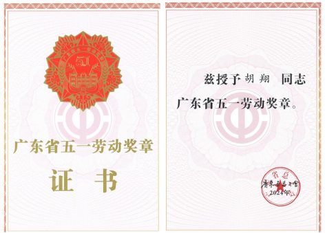 2015级校友胡翔荣获“广东省五一劳动奖章”